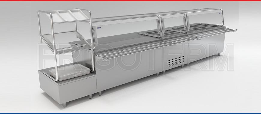 Linija za samoposluživanje Materijal izrade: prohromski lim Poručioc bira izgled i dužinu linije prema potrebi i uslovima prostora. Kombinuju se topli, rashladni i neutralni delovi sa delom za pribor i naplatnim pultom.
