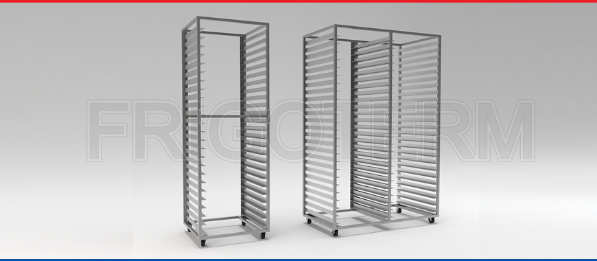Pekarska kolica Materijal izrade: Prohromski lim i prohromski kutijasti profil. Izrađuju se dve vrste pekarskih kolica, jednoredna i dvoredna u standardnim veličinama za pleh ili po meri poručioca. 400 x 600 mm i 800 x 600 mm